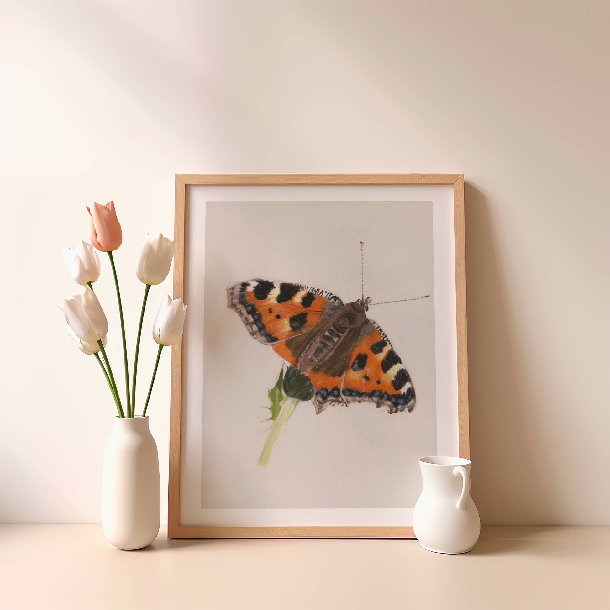 Delicate, vibrant, and full of grace, the Small Tortoiseshell Butterfly brings a touch of nature’s brilliance into your home. This fine art print captures the intricate beauty of one of the most beloved butterflies, showcasing its vivid hues and delicate wings as it settles on a grass head.